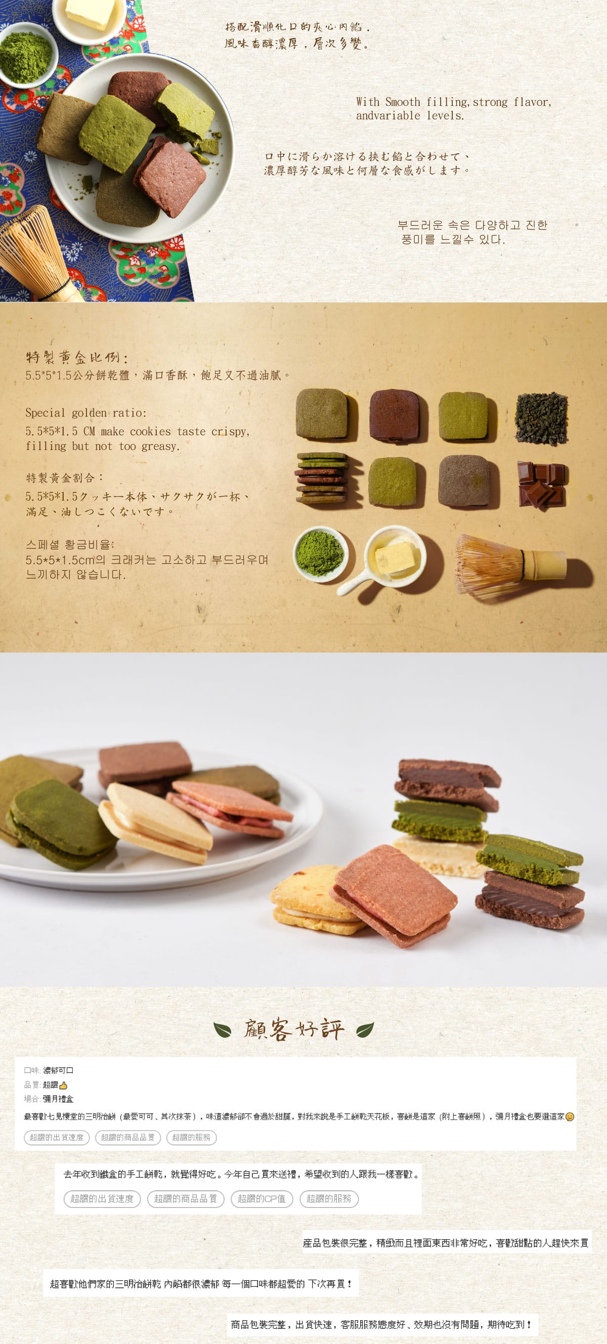 七見櫻堂人氣三明治餅,以「濃、酥、綿」的多層次口感搭配東方茶香,特別研製四款茶風味餅乾。外盒設計融入台北101、台灣黑熊等在地元素,展現濃厚的台灣特色,是深受喜愛的熱銷伴手禮。