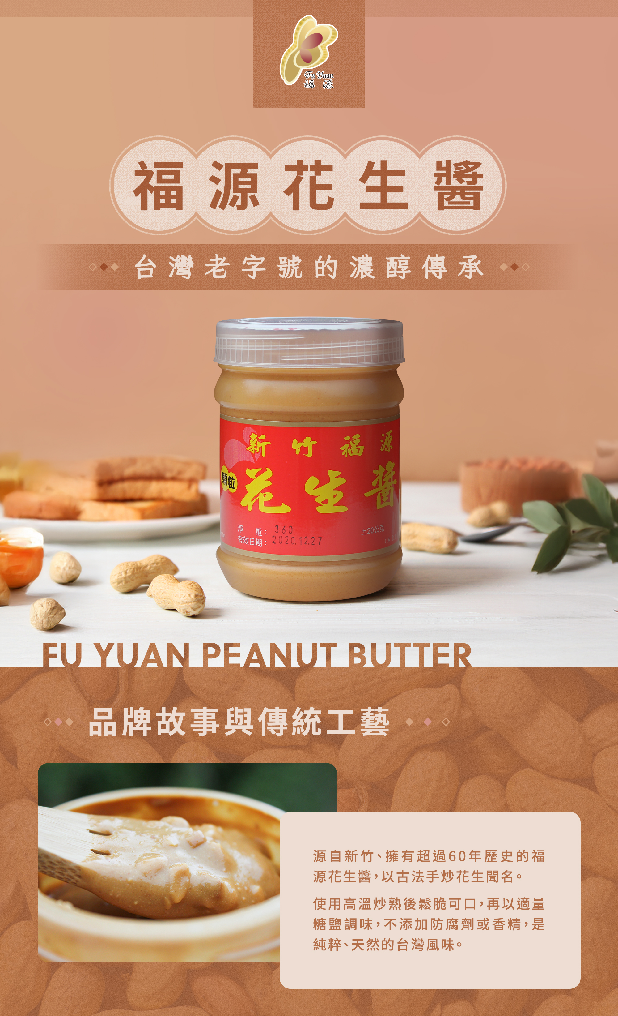 「福源花生醬」已創立七十年之久,至今仍依循古法製作與配方比例,從花生烘焙到現榨花生醬都是店家一條龍作業,甚至在最後封膜都是採手工充填,不以機器取代,保留最傳統原始的生產模式,而花生醬裡純粹只用鹽、糖、花生粒三種原料榨取混合而成,不添加防腐劑,從此也可看出唯有花生品質好,才能無懼花生醬最為人詬病的黃麴毒素。是台灣知名度最高的花生醬品牌,純手工製造,不加一滴水,也無防腐劑,口感綿密、香氣濃郁,還吃得到顆粒,讓人百吃不厭。