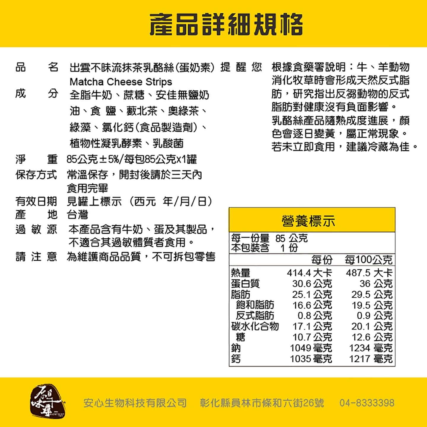 原味千尋出雲不昧流抹茶乳酪絲,光是名稱聽起來就超級有文學氣質~~出雲是抹茶產地,不昧流是日本茶道流派。甜中帶苦的抹茶,是超多女孩子心中第一名的夢幻,乳酪絲和抹茶的結合,您有想像過嗎?口味超級涮嘴!忍不住一口接一口。無防腐劑,源自天然,香醇濃郁。100%牛奶製作,純天然,熊安心。富含高天然鈣,吃得美味又健康。16公斤牛奶僅製成1公斤乳酪絲,手工剝絲。更榮獲世界品質評鑑大賞、亞太無添加美食獎。黃金乳酪絲的美名絕對是實至名歸。